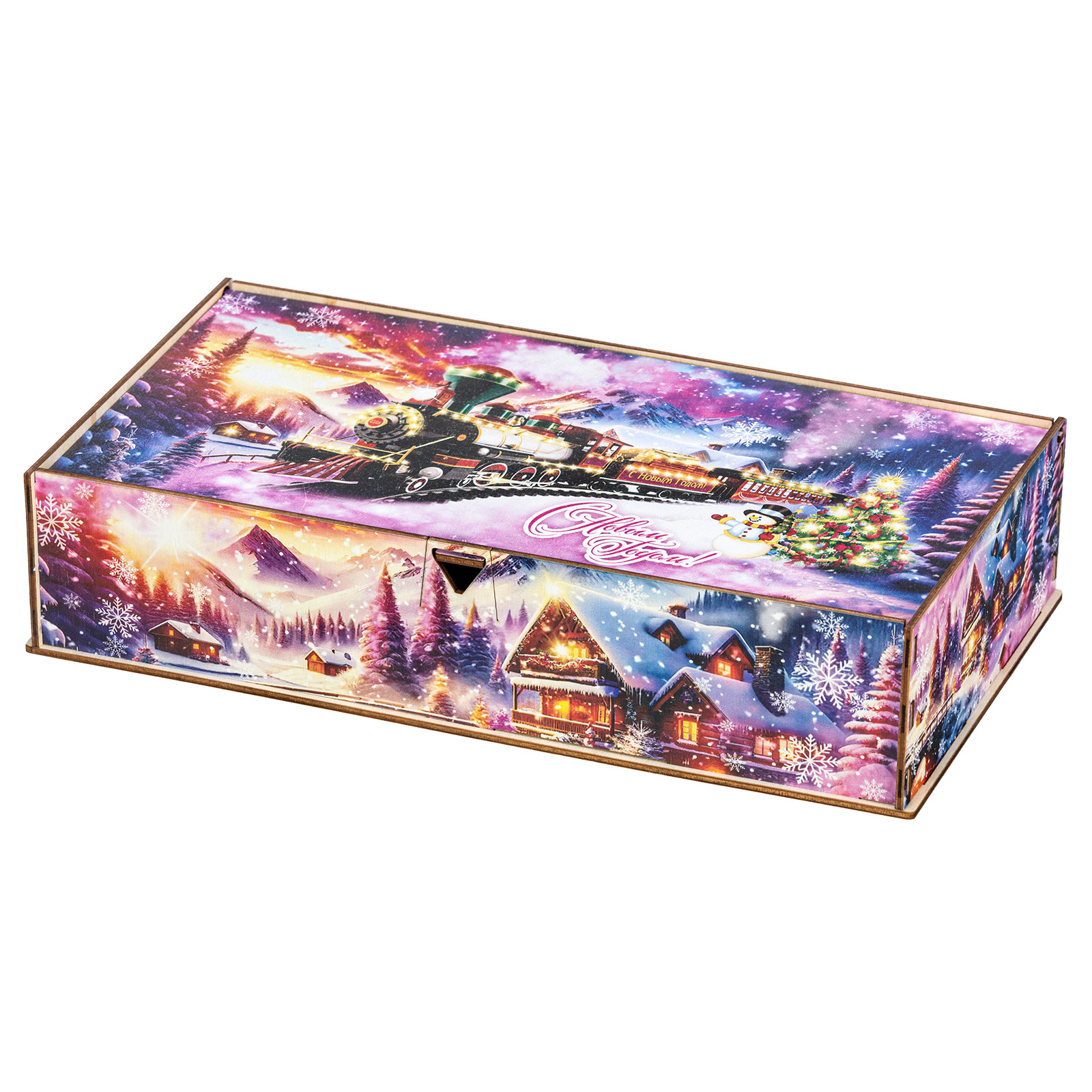Секрет идеального новогоднего сладкого подарка прост: это яркая привлекательная упаковка и вкусные сладости внутри. “Снежный экспресс” - это подарочный набор, который как раз прекрасно подходит под эти характеристики. Это небольшая деревянная коробчка с очень необычным ярким оформлением. На ней изображен зимний вечер в небольшой деревне, рядом с которой по железной дороге весело мчится праздничный поезд. В этом поезде находятся счастливые люди, которые вот-вот смогут увидеться со своими родными и друзьями и отпраздновать с ними Новый год. В подарочный набор входит килограмм разнообразных сладостей, небольшой памятный сувенир и безграничная радость для всей семьи!