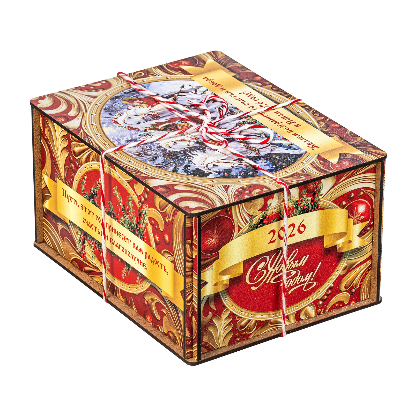 Ищете новогодний сладкий подарок подростку или взрослому? Присмотритесь к набору “Золотые узоры” - это оригинальный конфетный набор в яркой упаковке. В подарок входит килограмм вкусных и разнообразных кондитерских изделий от ведущих фабрик, а также небольшой памятный сувенир в виде символа наступающего 2026 года.  Сладости бережно упакованы в небольшой деревянный ящик, выполненный в сочетании золотого и красного цветов. На крышке есть небольшая иллюстрация с изображение Дедушки Мороза в упряжке белых грациозных лошадей. Упаковка аккуратно перетянута цветной ручкой шнурком, что еще больше добавляет ей привлекательности.